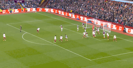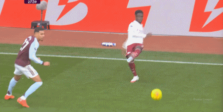 所以在第28分钟,阿斯顿维拉完成抢断之后,发动了左路的进攻,一脚传中打到禁区内,便来到了后点的卡什脚下: