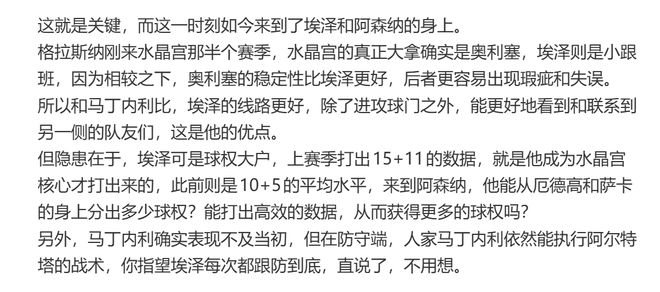 按照埃泽在水晶宫的踢球习惯,在水晶宫的他不用大幅回防,因为他顶多是防守第八人,部分回合萨尔会更多回防,埃泽甚至是可以不用防守的第九人。