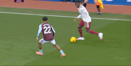 最大的潜在危险信号,其实是第25分钟这次防守当中,阿斯顿维拉的左后卫马特森带球上来,能直接冲倒廷贝尔: